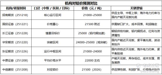 目前多数机构对于未来铝价维持景气高位的判断高度一致,多家机构将2026年至2028年铝行业利润预期调高至5000元/吨、5500元/吨、6000元/吨,对应铝价分别为21500元/吨、22000元/吨、22500元/吨。
