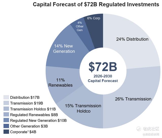 答案其实很简单:投钱、扩网、收租。 AEP 计划在未来五年投入 720 亿美元用于电网升级。在电力行业的规则里:只要投资被监管认可,就会计入“监管资产基数”。通俗点说,AEP 投得越多,它的资产基数就越大,监管允许它赚取的合理利润就越多。
