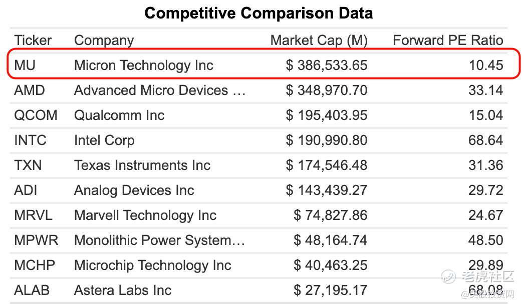 基于 2026 年的盈利预测,美光的前瞻市盈率其实只有 10.45 倍。对比同在 AI 赛道的其他巨头,AMD 的估值高达 33 倍,英特尔更是达到了 68 倍,作为 AI 核心存储(HBM)的供应商,美光的价位显然被严重低估。