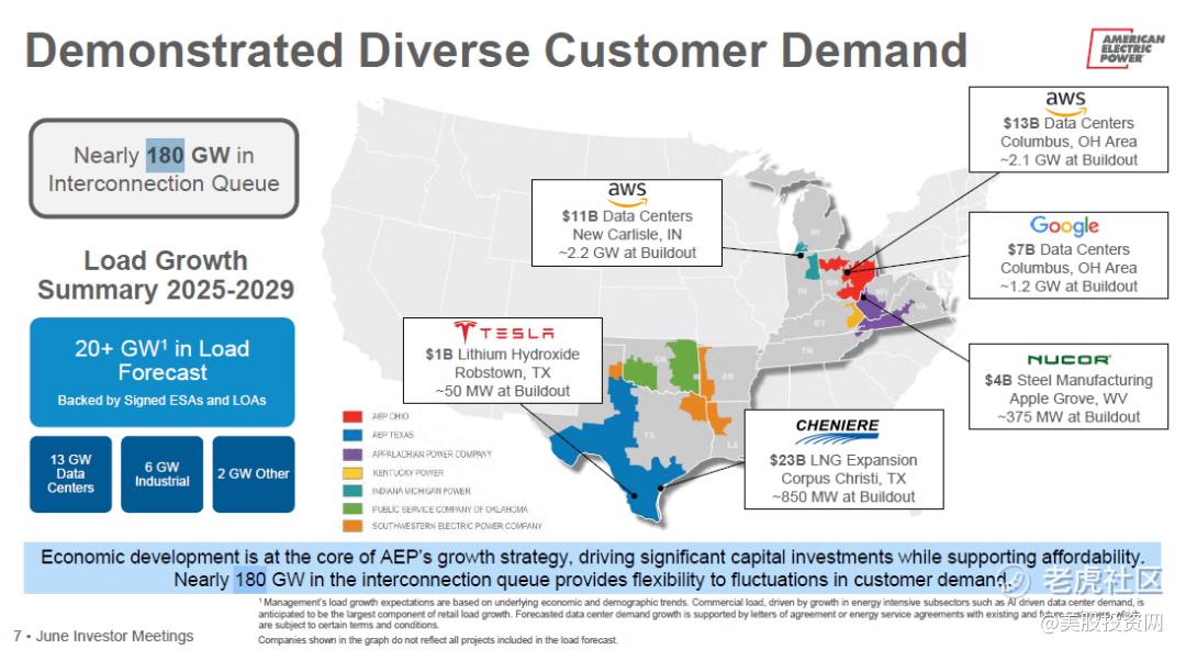 AEP 的需求预测非常惊人:到 2030 年,它的系统用电峰值将飙升接近 80%!目前,亚马逊、谷歌和 特斯拉这些巨头已经提前锁定了 28GW 的负荷,后面甚至还有 180GW 的潜在项目在排队。