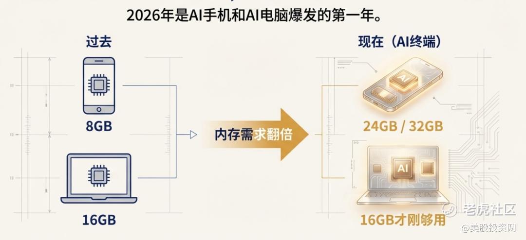 更让市场疯狂的是,2026 年刚好是 AI 手机和 AI 电脑爆发的第一年。为了跑得动本地 AI 助手,电脑内存 16GB 才刚够用,高端手机更是直接奔着 24GB 甚至 32GB 去了。