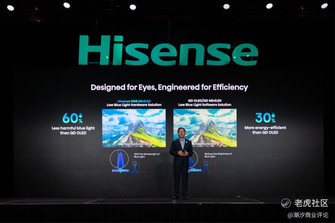通过光源和光色同控进化,海信电视RGB-Mini LED实现了有害蓝光比QD-OLED降低60%,比传统QD-Mini LED降低75%,能耗降低30%,保证用户观看体验的同时做到护眼,还能实现超高画质与超低功耗的统一。
