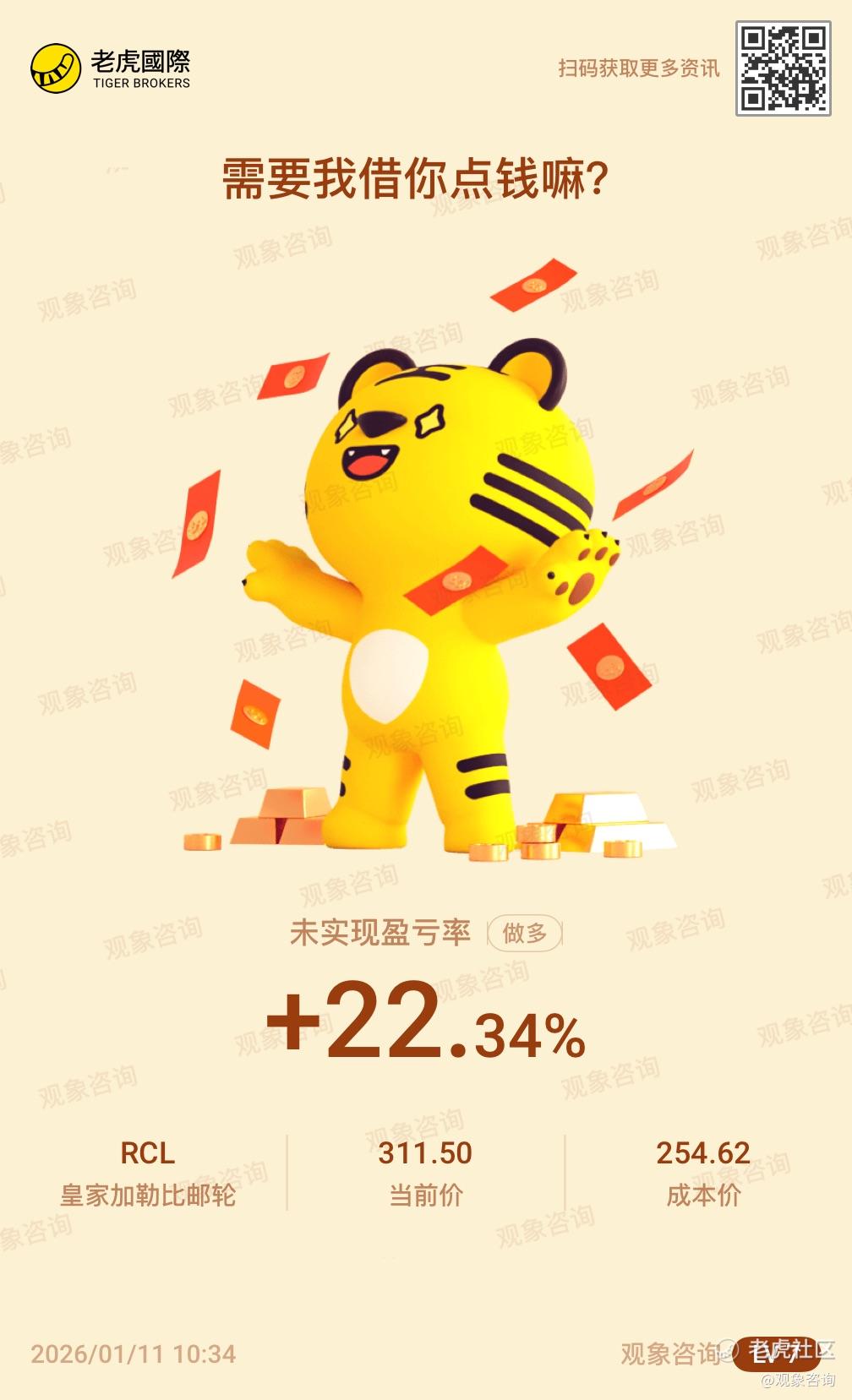 $皇家加勒比邮轮(RCL)$ 在将止损单设在 275 美元后, $RCL的价格上涨至 311.50 美元,止损单并未触发。然而,该价格已接近其 2026 财年估值的上限。因此,我将调整盈利策略,设置追踪止损单,止损位设为 10 美元或 3%。这将为我提供更好的保护。