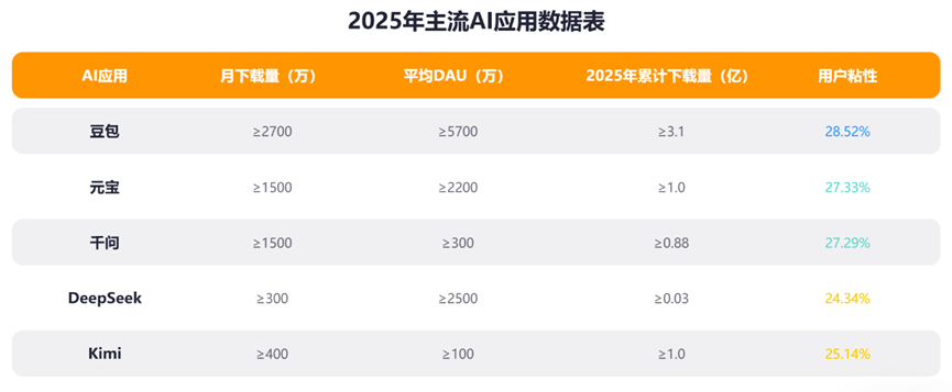 并且据量子位智库统计的数据,2025年12月,豆包在“月下载量”、“平均日活”、“2025年累计下载量”、“用户粘性”四个方面,都是国内AI应用中的第一,且领先优势较大。