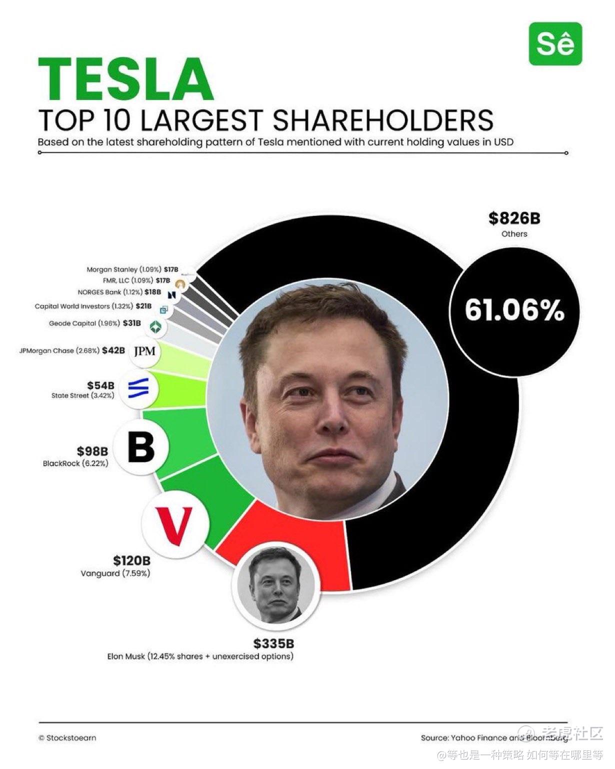 Elon Musk 依然是 $TSLA 的绝对核心股东,合计约 12.45%(含期权)。