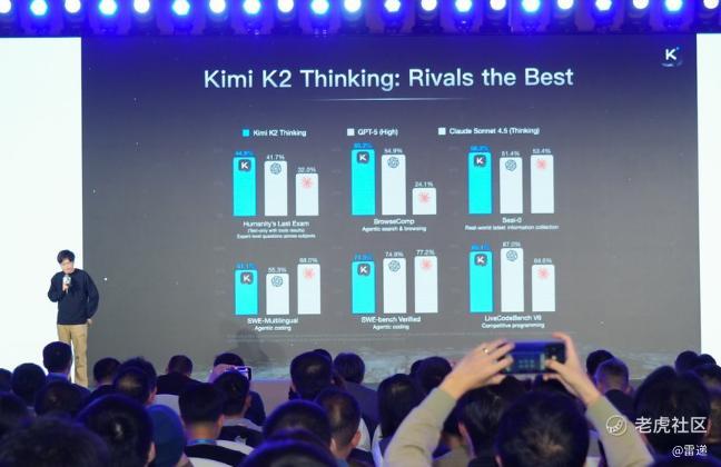在kimiK2很好的模型上面,我们又做了很多强化学习,后训练等等,但是这不是今天重点,重要的是有几个点,我们在各种agent的能力上全面提升,而且可以对标美国前沿的公司。同时,很重要的一个点是在最核心的点上,比如说HLE,里面99%的题我都不知道怎么做,但是模型现在可以做到45%的准确率,而且比OpenAI更高,你在最核心的数据上比美国公司更好,这是很重要的亮点。同时,它是一个完全agent的模型,kimiK2是中国第一个agent模型,K2 Thinking升级以后,可以完成两百百步的工具调用,解决一个很难的题的时候用它写一写程序。两三百步之后,可以完成我完全看不懂的题,但是它的答案是对的。