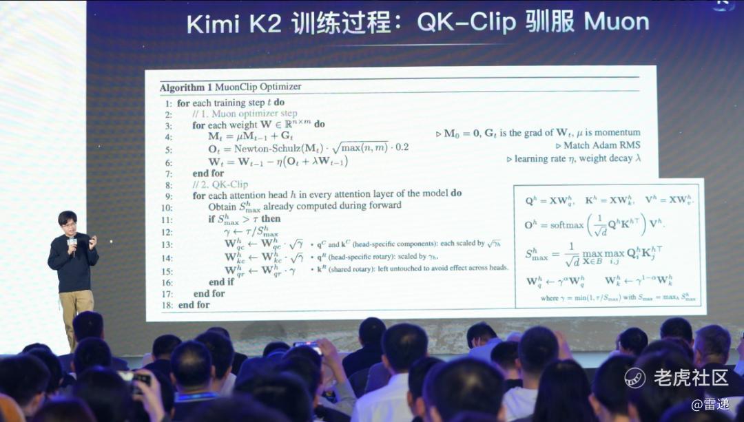 这里面很重要的一个点是通过一个新的方法解决Muon爆炸的问题,我们也试了很多方法,QK-clip效果非常火,但是这里有一些细节,你做QK映射的话,会乘上一个数值,这个数值是由当前QK最大的Logit决定的,可以动态的让它clip特定的取值里面。
