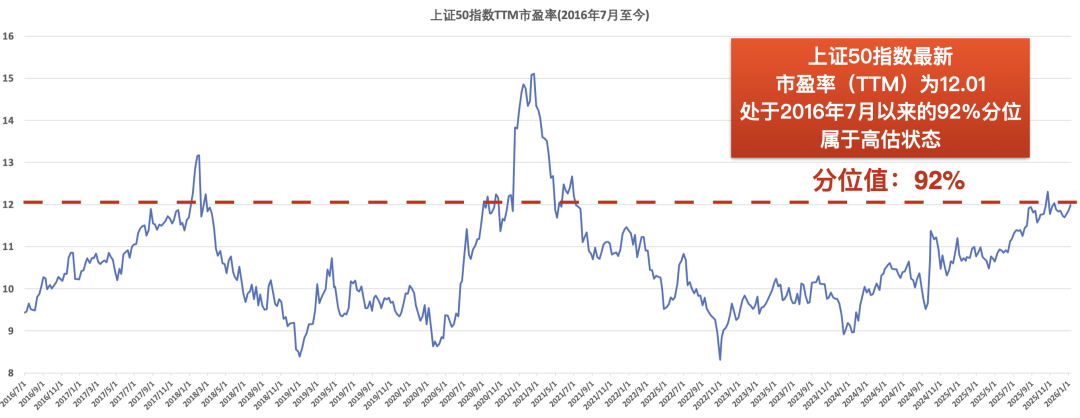 截至2026年1月9日收盘,上证50最新市盈率为12.01,估值位于2016年7月以来的92%分位值处,属于高估状态。关于指数估值的最新数据和更多讨论可点击查看《估值分析》合集