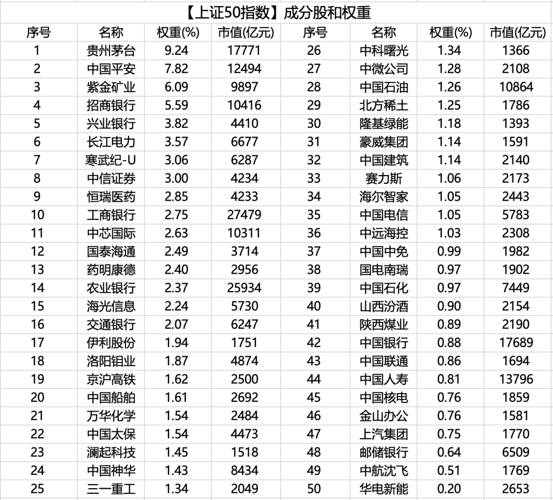 上证50指数由沪市中规模大、流动性好的最具代表性的50只股票组成,反映上海证券市场最具影响力的一批龙头公司的股票价格表现。热门成分股有工商银行、招商银行等银行股,茅台、伊利等食品饮料消费题材,平安、人寿等保险题材,中国建筑、中国石油等中字头个股,隆基、长江电力等新能源龙头,药明康德、恒瑞医药等生物医药龙头,以及寒武纪、韦尔股份等科技前沿公司等等。根据指数编制方案,上证50指数每半年进行一次成分股样本调整。本期变动新调入上汽集团、北方稀土、华电新能、中科曙光4家公司;保利发展、中国移动、中国铝业、中国中车被调出指数。
