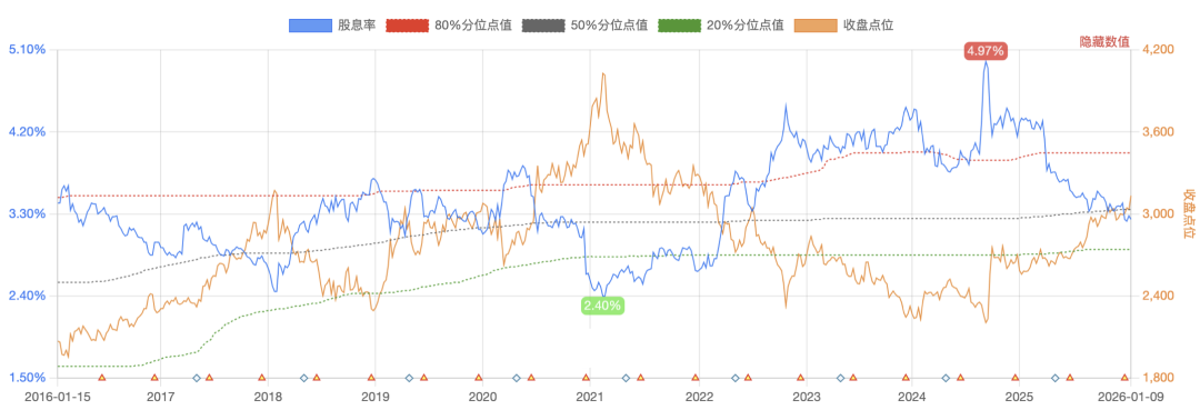 由于上证50指数央国企占比较高,重资产比重大,所以整体上股息率较高,我们亦可以采用股息率来看指数的估值。可见过往股息率较高时往往对应着指数阶段的低点,反之,股息率较低时则对应着指数的高点。目前指数股息率降至3.24%,为2022年初以来最低水平,在指数成分股公司整体分红逐年提升的情况下,股息率下降,也侧面说明了短期的股价涨多了。