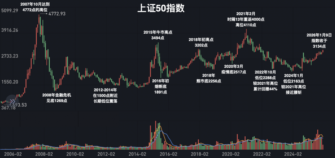 上证50指数目前的最高点为4772.93点,出现在2007年10月牛市巅峰之时,一年后的2008年最低跌至1269点,随后直到2015年才再次重返3000点大关。