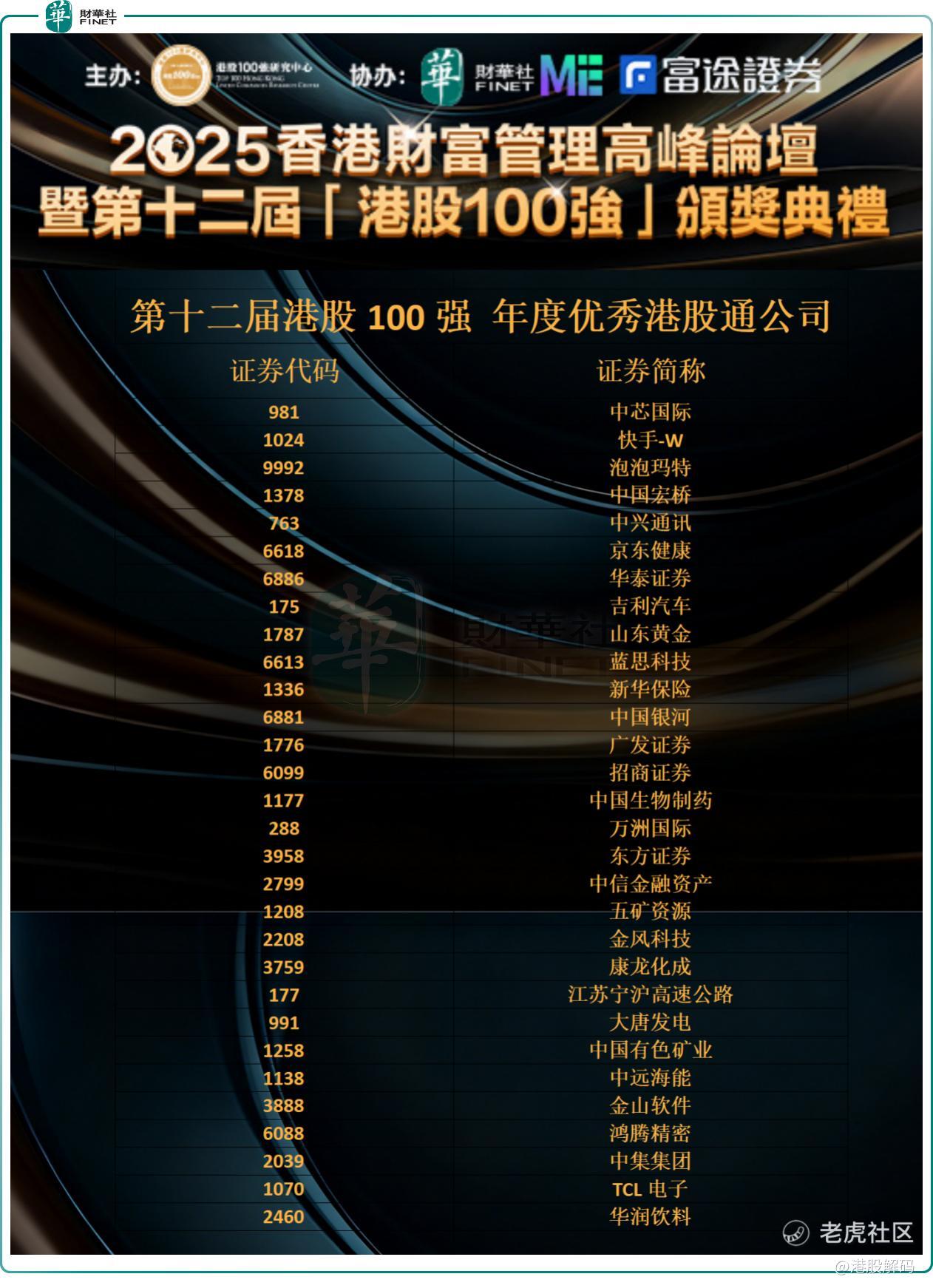 以下是第十二届港股100强“年度优秀港股通公司”榜单获奖企业名单(30名):