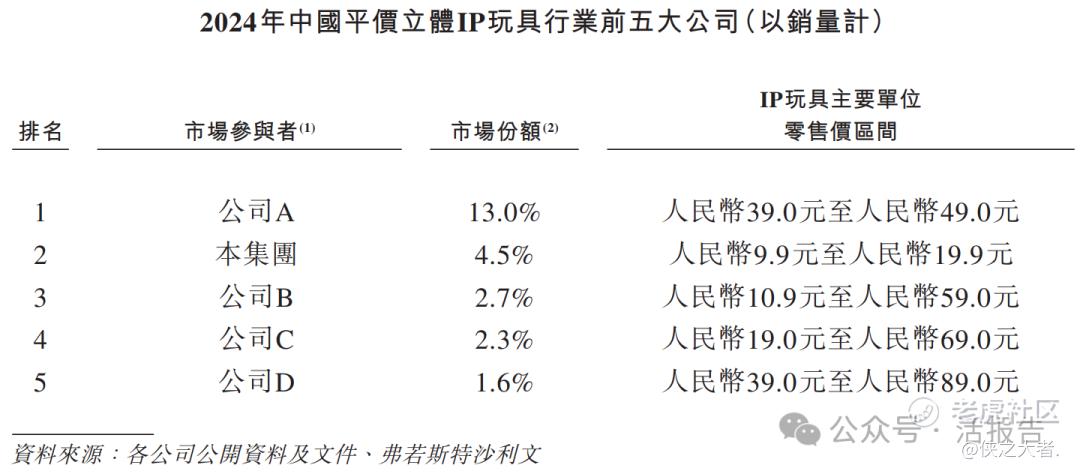在中国平价立体IP玩具企业前五强中,公司是唯一一家专注于提供定价为人民币20.0元及以下IP玩具产品的企业。按2024年定价为人民币20.0元及以下IP玩具的销量计,公司在中国平价立体IP玩具产业中排名第一。