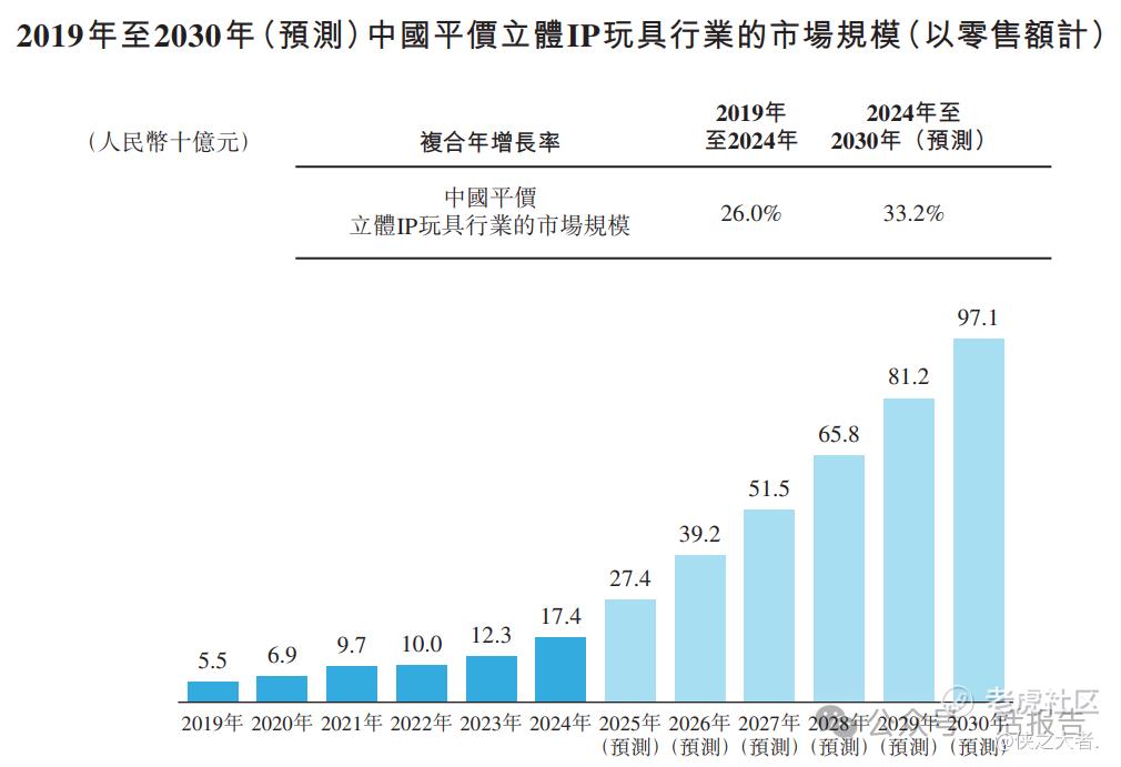 根据弗若斯特沙利文(Frost & Sullivan)的报告,按零售额计,中国平价立体IP玩具行业的市场规模于2024年达人民币174亿元,并预计2024年至2030年间按33.2%的复合年增长率增长,于2030年达到人民币971亿元。