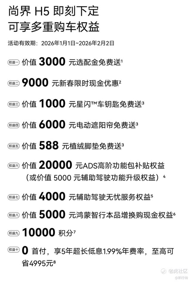 **“第五界”,也是鸿蒙智行体系中价格门槛最低的车型——尚界,则是针对首款车型尚界H5给出了新年十大限时购车权益,综合优惠价值至高 54,583 元,同时还可叠加置换 / 报废补贴及金融政策,部分地区更有额外地方补贴。