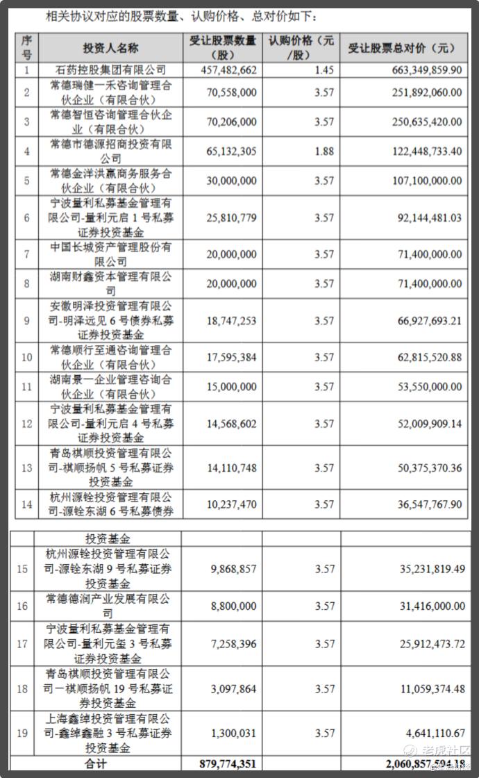其中,石药集团仍为牵头人,受让股票数量已超一半,约为4.57亿股,认购价格1.45元/股,较此前价格上涨45%,受让股票总对价约为6.63亿元。