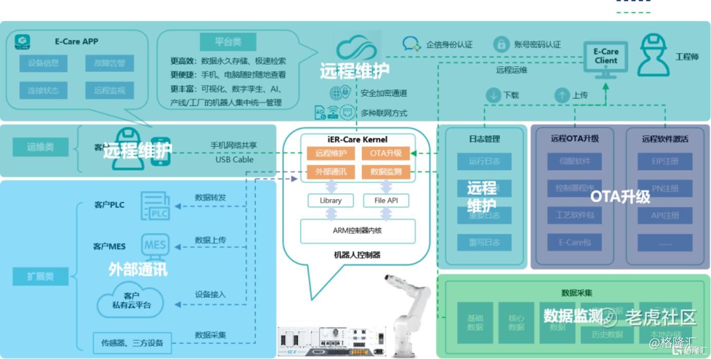 iER.OS 以数据、应用、AI为核心,实现从封闭架构到开放架构、云边协同的系统跨越,不仅显著提升运动控制性能,更在开放性、智能化与协同性上取得突破。通过构建“机器人+AI”架构,打通数据接口、感知模块与控制核心,强化机器人的环境感知、实时分析与自主决策能力。同时,iER.OS 提供丰富的算法库与模块化开发工具,支持用户及合作伙伴自主开发、封装与部署专属工艺包。开放AI集成接口,基于“外脑”的力量,不断提升系统的智能分析与决策能力。
