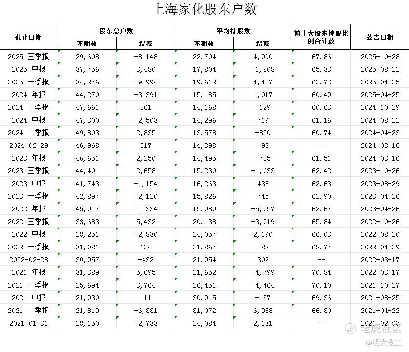 最后再看一组有意思的数据,三季度末上海家化股东人数再次降至3万人以下。要知道上次股东人数在这一水平还是2021年,那年上海家化股价创下历史新高。