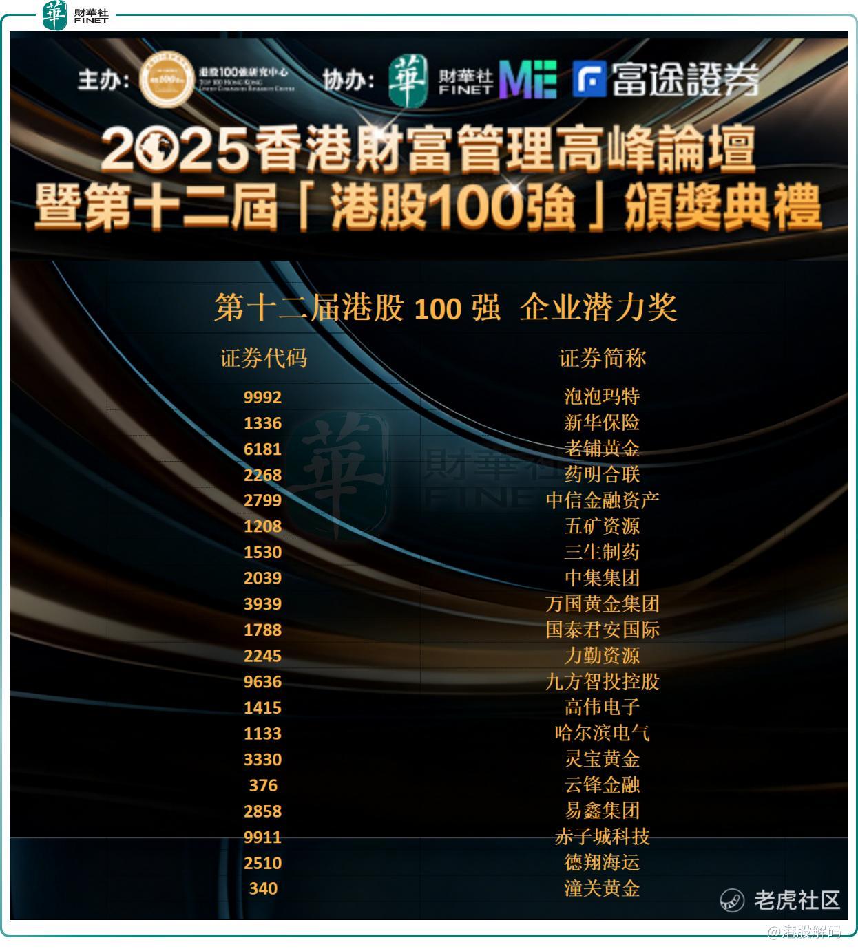 在激烈的市场竞争中,共有20家企业凭借出众的发展潜力脱颖而出,荣登本届“企业潜力奖”榜单。其中,新消费领军企业 $泡泡玛特(09992)$ 强势上榜, $新华保险(01336)$ 、 $老铺黄金(06181)$ 、药明合联(02268.HK)、中信金融资产(02799.HK)、五矿资源(01208.HK)、三生制药(01530.HK)、中集集团(02039.HK)、万国黄金集团(03939.HK)、国泰君安国际(01788.HK)等企业也凭借卓越表现跻身榜单之列。