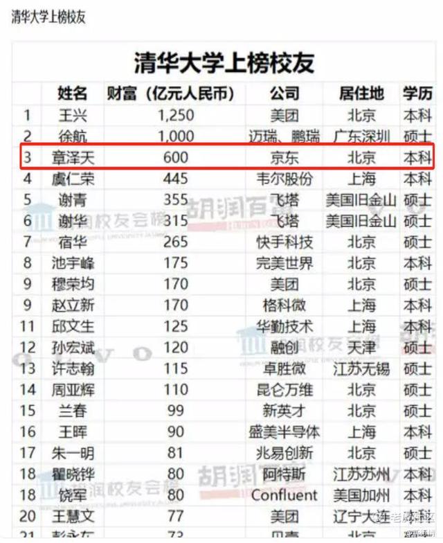 2024年胡润研究院发布《胡润校友会榜》,清华大学上榜校友的名单中,章泽天以净资产600亿的身家在清华优秀校友中高居第三位,个人财富仅次于美团创始人王兴的1250亿元和迈瑞医疗徐航的1000亿元。