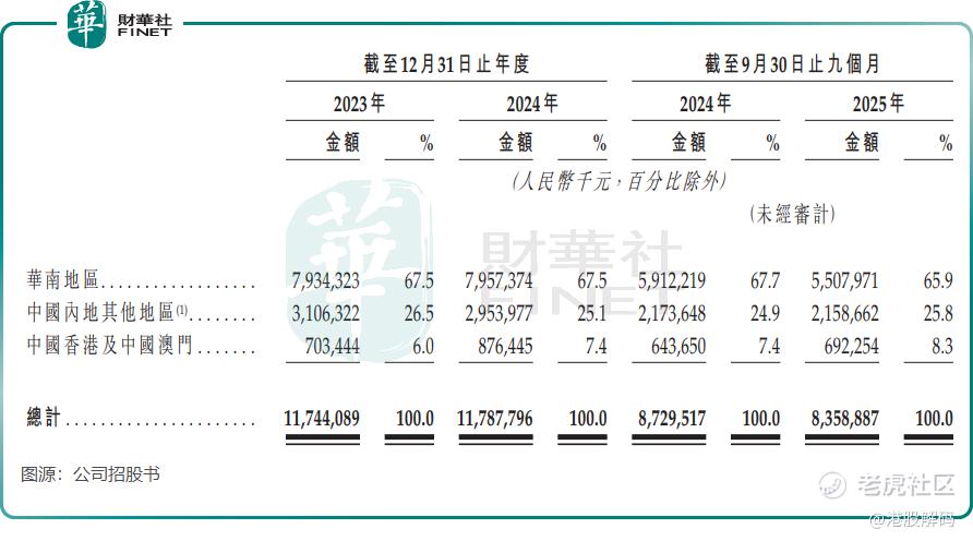 钱大妈面临更棘手的挑战是市场区域依赖。招股书显示,2025年前三季度,华南市场贡献了65.9%的营收,但该区域收入同比下滑6.8%。公司解释主要受猪肉及蔬菜市场价格下跌影响,但不可忽视的是,公司华南市场门店日趋饱和,新增门店对业绩拉动作用减弱,门店密度过高导致的内部分流问题也逐渐显现。