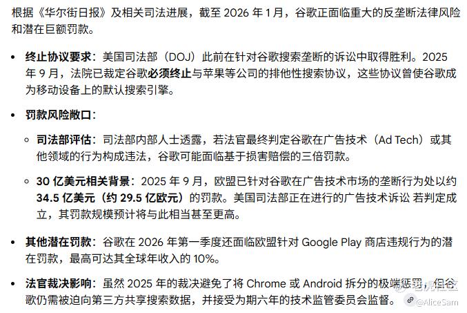 2025年8月,美国司法部对“搜索默认协议”提起诉讼,认为谷歌每年付给苹果200亿美元“买默认”涉嫌滥用垄断,新增加的“AI 模型默认”是否纳入同一案由,这是一个问题。看新闻里提到,司法部内部人士向《华尔街日报》透露“在评估”,若法官判定违法,谷歌需终止协议并面临三倍罚款,即 30 亿美元风险敞口。