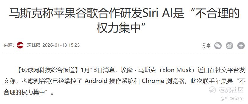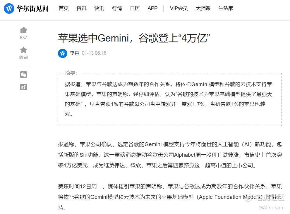 今天,2026年1月13的清晨,苹果在CNBC镜头前酷酷的给出一句简短确认 - 下一代 Siri 与 Apple Intelligence 将由 Google Gemini 驱动。这消息仅只有 57 个英文单词,却足以让两家合计市值 6.7 万亿美元的巨头在盘中逆向拉升!