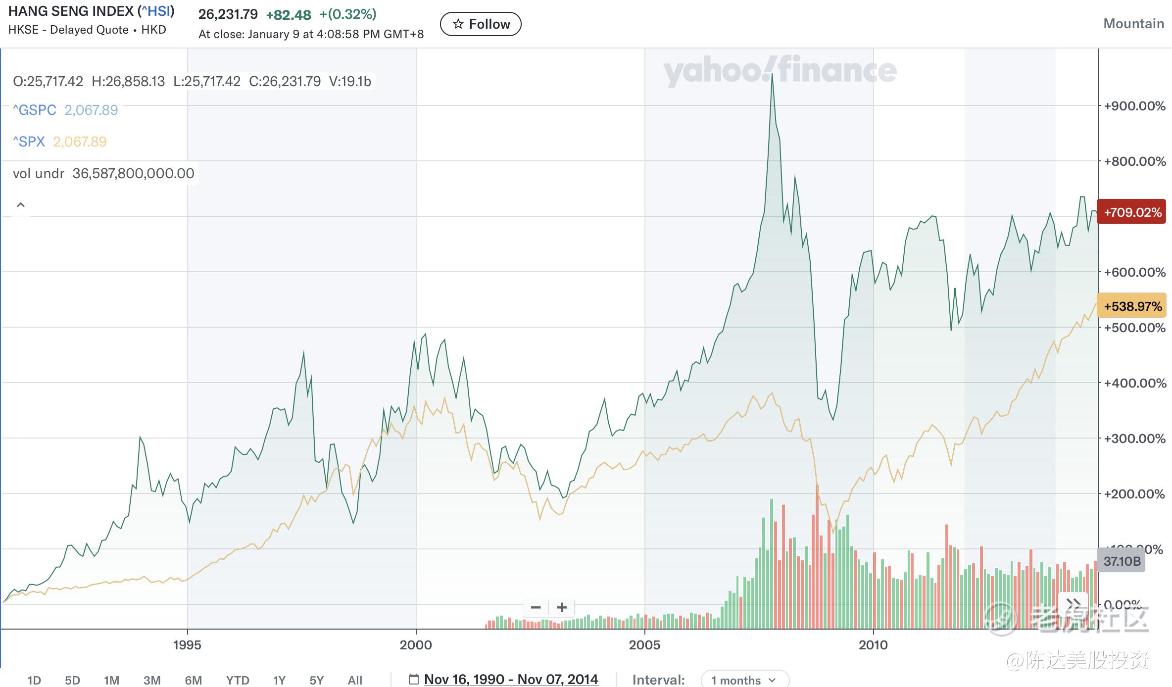 (恒生指数(绿)与标普500指数(黄)在港股通之前的走势图,数据来源:Yahoo!Finance)