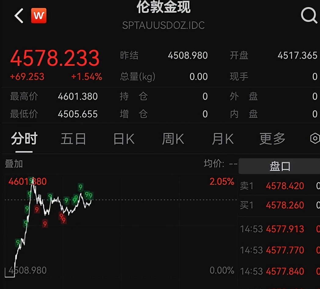 现货黄金历史性突破4600美元/盎司关口,一度涨超2%,随后略有回落,但仍上涨超过1个点。