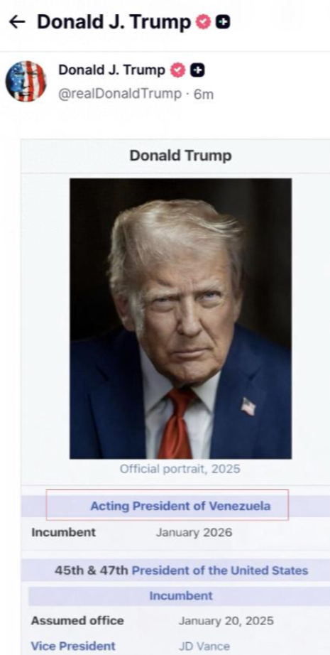 万万没想到,11日特朗普在“真相社交”上发了一张自己最新的简介,现在他不仅是美国总统,也是委内瑞拉代总统!自己给自己封了个新官?