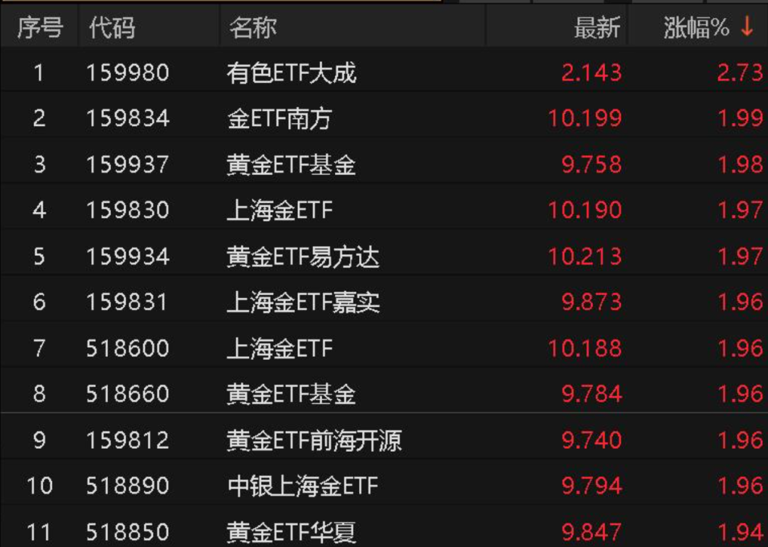 A股跟踪黄金的相关ETF全线上涨,其中黄金ETF基金上涨1.96%,黄金ETF华夏上涨1.94%。