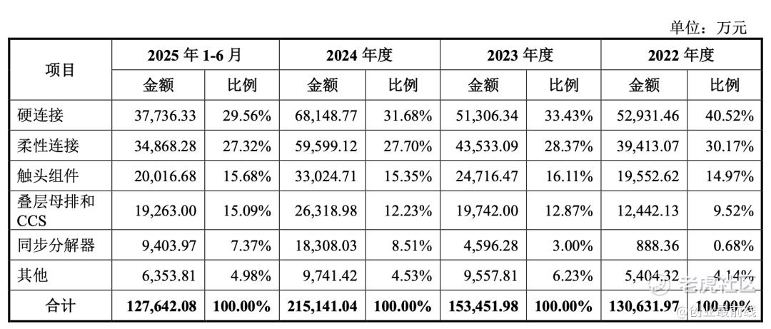 报告期内,硬连接产品的营收规模一直最高,但占主营业务收入比例从2022年的40.52%降至2025年上半年的29.56%。