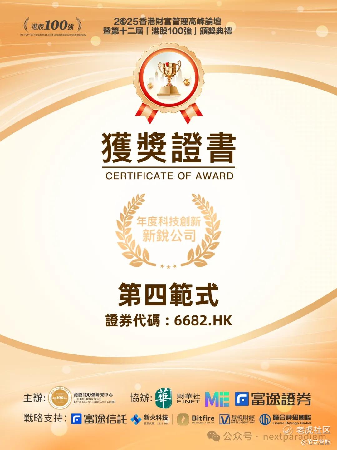 在近日举行的2025香港财富管理高峰论坛暨第十二届“港股100强”颁奖典礼上,范式智能 $06682(06682)$ 荣膺“年度科技创新新锐公司”奖项。同期获此殊荣的还包括商汤科技、地平线、美图、优必选等中国科技领域的标杆企业。