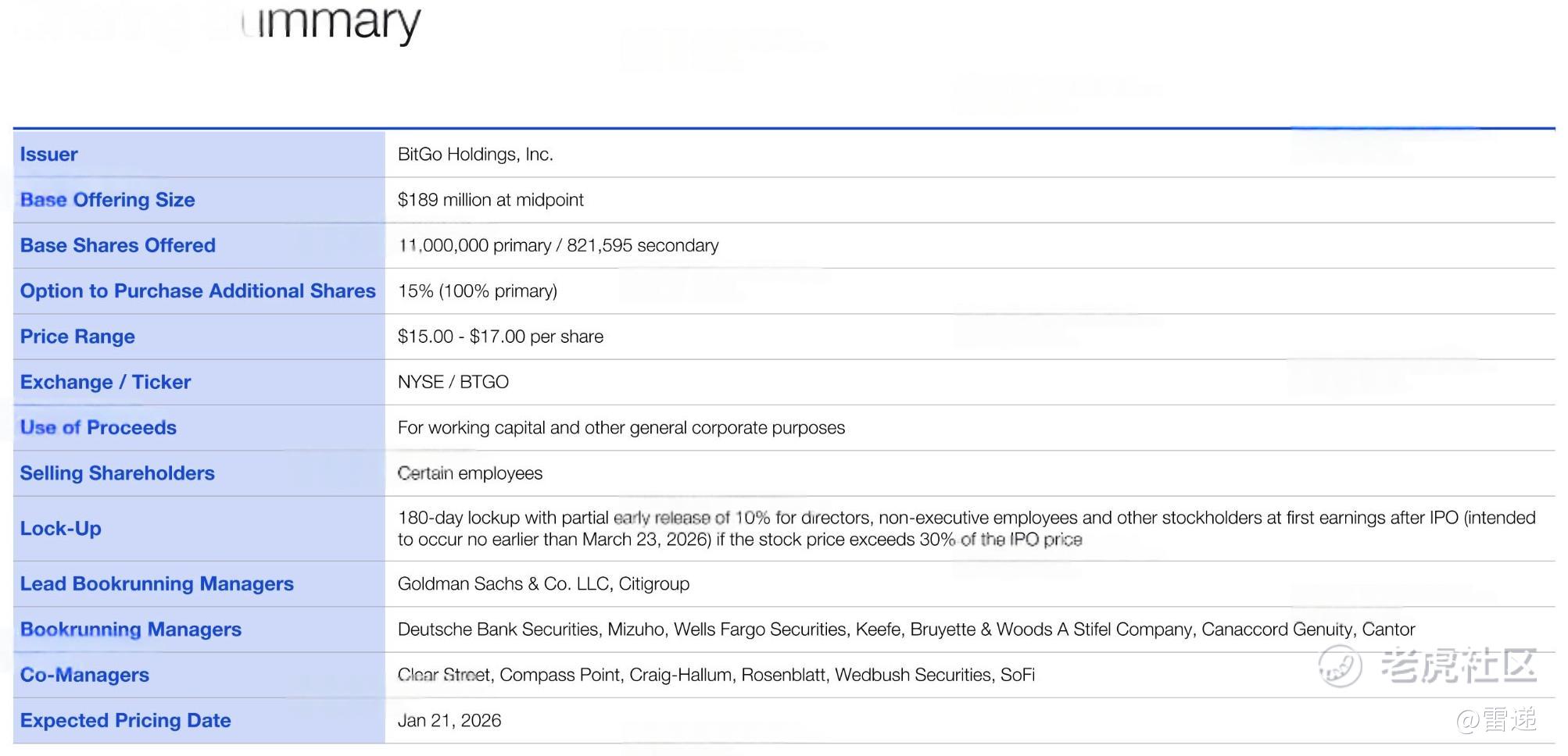 BitGo发行区间为15美元到17美元,发行1100万股,最高募资1.87亿美元,估计估值19.6亿美元;现有股东出售82万股,最高套现1394万美元。