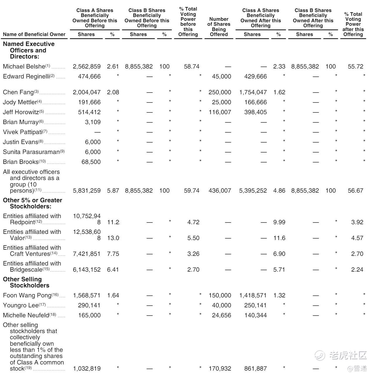 Redpoint持有9.99%的A类股,有3.92%投票权;Valor持有11.6%的A类股,有4.57%的投票权;Craft Ventures持有6.9%的A类股,有2.7%的投票权;Bridgescale持有5.71%的A类股,有2.24%的投票权。