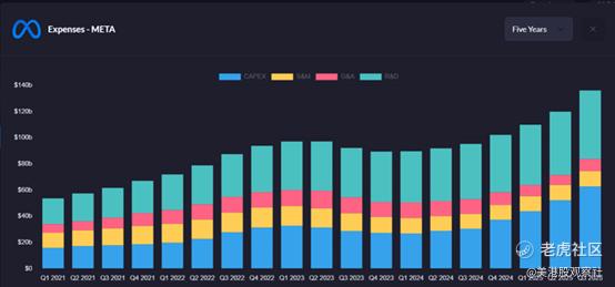 下图展示了Meta包含资本支出在内的总费用与折旧费用的对比情况。尽管过去几年总费用呈上升趋势,但从这一维度来看,这家社交媒体巨头的支出规模并未出现失控式增长。