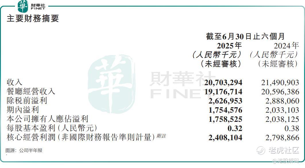 从经营数据来看,海底捞已陷入明显的增长停滞。2025年上半年财报显示,公司实现营收207.03亿元(单位人民币,下同),同比下降3.7%;核心经营利润24.08亿元,同比下降14.0%。公司拥有人应占溢利17.59亿元,同比下滑13.7%。