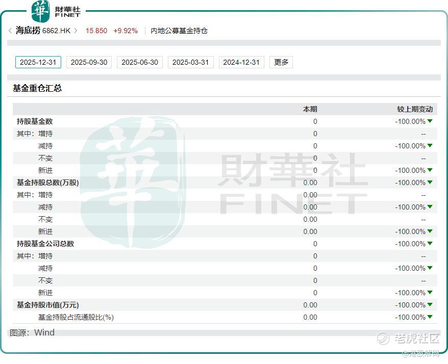 雪上加霜的是,资本市场信心持续流失。截至2026年1月13日收盘,海底捞股价较五年前的历史高点已暴跌超过80%。机构投资者也在撤离,Wind数据显示,2025年末重仓海底捞的内地公募基金数量从2024年末的25只锐减至0只。高盛和摩根大通等知名机构相继退出,市场忧虑情绪浓厚。