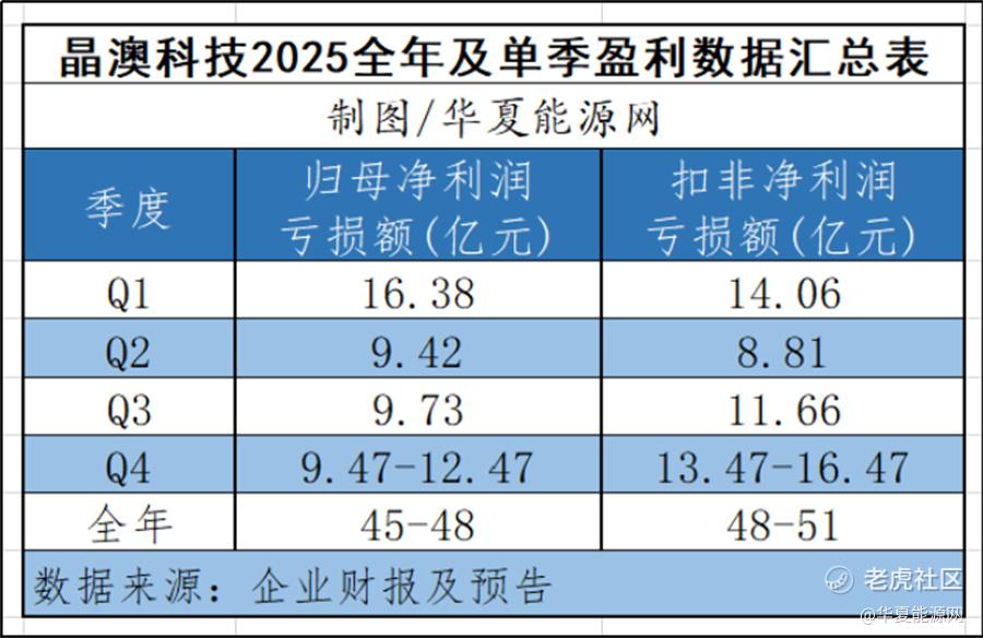 华夏能源网注意到,2025年前三季度,晶澳科技扣非净利润亏损34.53亿元。据此计算,公司第四季度扣非净利润预计为13.47亿元—16.47亿元,不仅超过二、三季度,还有一定概率超过一季度亏损(扣非净利润亏损14.06亿元),成为2025年度亏损最大的单季。