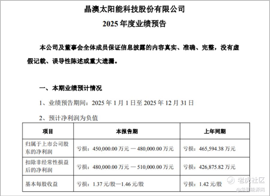 华夏能源网获悉,1月12日晚,晶澳科技(SZ:002459)发布业绩预告称,2025年预亏45亿元—48亿元。