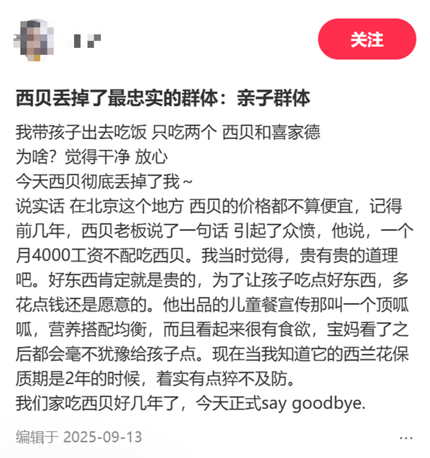 成也萧何,败也萧何。西贝靠亲子定位获得了“高溢价”,但也因此面临着客户更苛刻的品质要求。