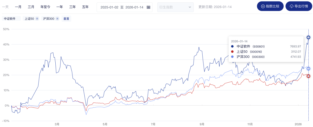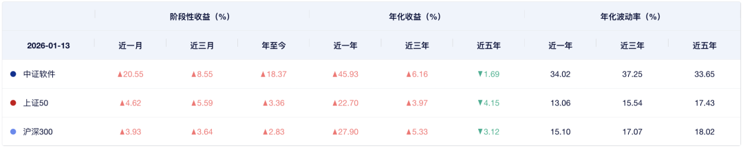截至1月14日,中证软件指数年内已涨超22%,大幅跑赢上证指数(3.96%)、深证成指(5.35%)、创业板指数(4.56%)。