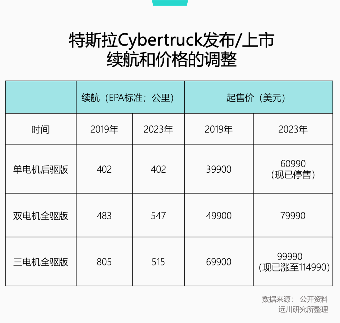 结果2023年底正式上市时,定价大幅上涨,高配版定价从6.9万美元涨到了9.9万(目前11.49万),续航却大幅缩水,市场表现可想而知。
