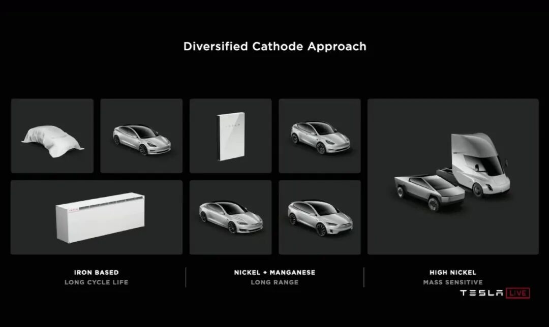 按照特斯拉的规划,Model 3车型以磷酸铁锂为主,Model Y/S/X采用含镍锰的三元锂电池,Cybertruck和Semi则用高镍正极的三元锂电池。