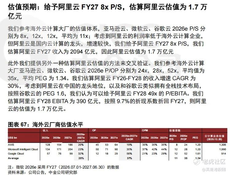 根据中金的预期,给予阿里云27财年8倍的PS,估算出阿里云估值为1.7万亿元,而目前市场还没有反应多少这预期,市场只给予了阿里云3-4倍的PS,目前的预期差还是比较大的,随着阿里云带动起市场情绪,其他互联网股也会跟着拔估值。
