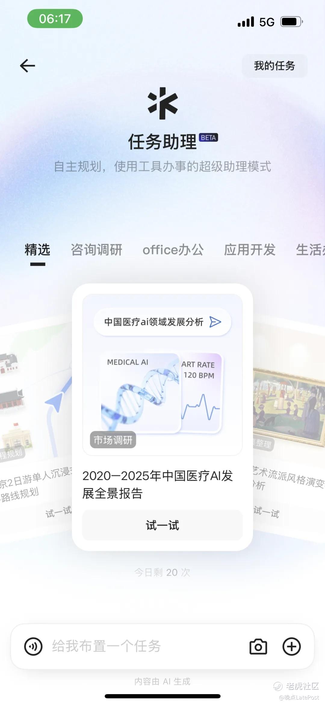 办事,千问 App 首页左下角上线了 “胶囊” 形式的 “任务助理”,能够处理复杂任务,需要像人一样完成多步骤的工作,包括但不限于打电话订餐厅、调研报告、处理财务文件、开发网站等, 目前该功能采用定向邀测。