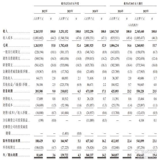 从财报数据来看,道通科技表现十分亮眼,近年营收与利润均保持强劲增长。2022 年至 2024 年,收入从 22.66 亿元增至 39.32 亿元 (单位为人民币,下同),复合年增长率达 31.7%; 同期净利润从 0.82 亿元大幅攀升至 5.60 亿元,复合增速高达 162.0%。2025 年上半年,公司实现收入 23.45 亿元,利润 4.55 亿元,分别同比增长 27.3% 和 26.4%,增长势头延续。