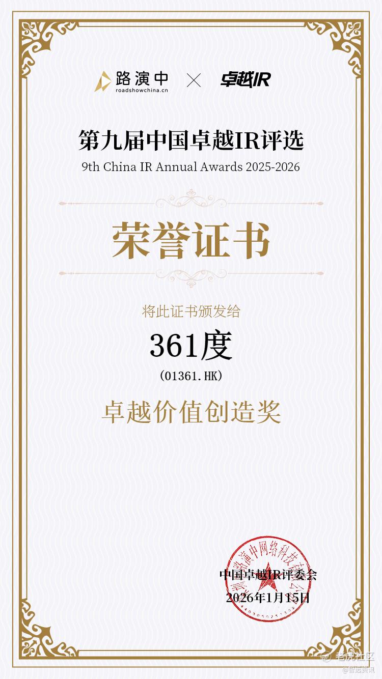 2026年1月15日,在第九届中国卓越IR评选中,361度国际有限公司(股份代号:01361.HK)凭借在投资者关系管理、资本市场沟通及价值创造方面的突出表现,荣获“卓越价值创造奖”、“卓越领袖奖”、“卓越总监奖”三大奖项。这一荣誉不仅是对公司过去一年工作的肯定,更是对其长期坚持透明沟通、积极创造股东价值的认可。