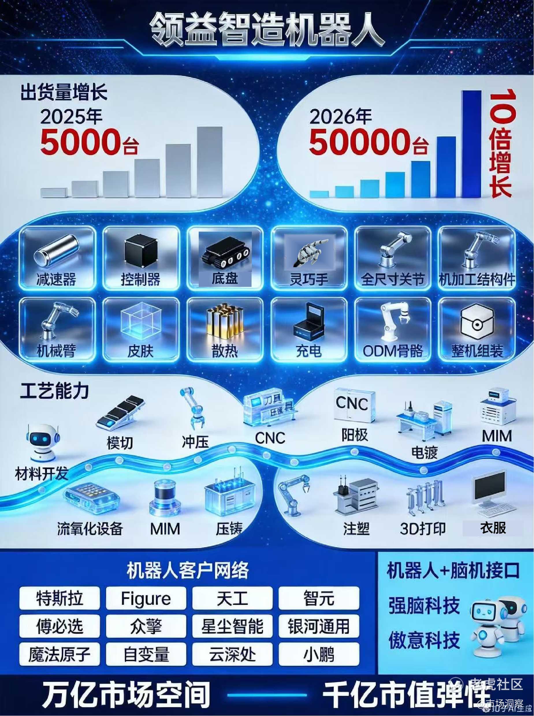 出货量增长2025年5000台,2026年50000台,万亿市场空间,千亿市值弹性,长期值得期待一下