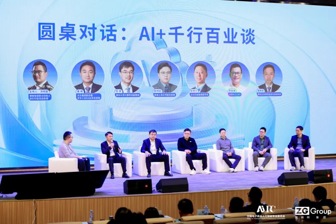 在随后的圆桌论坛环节,围绕“AI+千行百业谈”这一主题,来自投资机构、AI技术企业、学术界及传统产业的代表展开深入讨论。圆桌由攀峰智能联合创始人、前钉钉投资总经理汤明磊主持。京东集团副总裁、京东工业 KA 业务总经理潘峰,智谱上海公司副总经理麻玮跃,清华大学计算机系副教授任炬,云汉芯城首席数字官张明川,凯茵化工CEO李俊威以及腾讯云资源和能源专家架构师潘旻喆等嘉宾参与讨论。